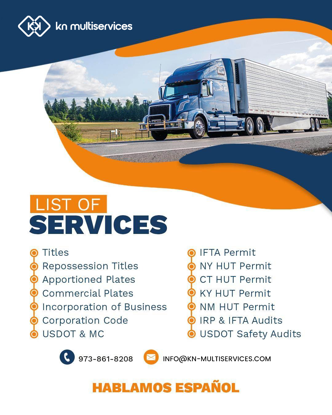 KN Multiservices Inc. provides reliable and affordable trucking compliance and documentation services. We specialize in apportioned plates, USDOT/FMCSA filings, business formation, and permits. We also offer title, tag, and notary services for all vehicles. Our team simplifies complex processes so clients can focus on growing their business.